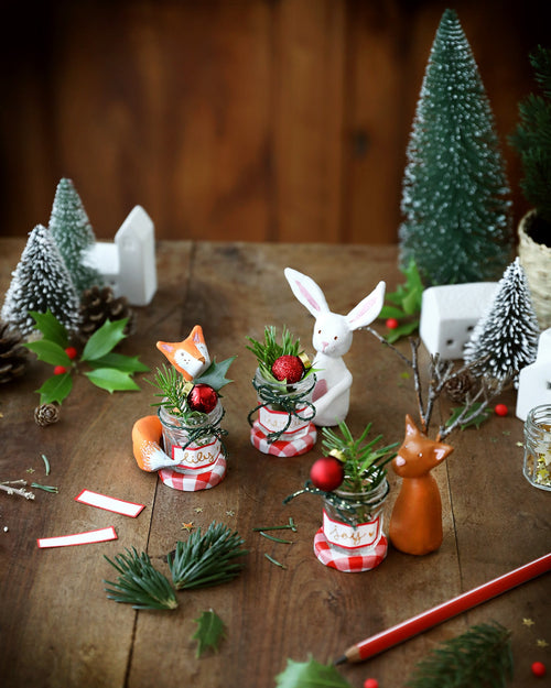 5 Maak mini-boeketjes, bijvoorbeeld met hulst en dennentakjes, om de Bonne Maman potjes te vullen. Voeg eventueel enkele sterretjes en kleine kerstdecoraties toe.