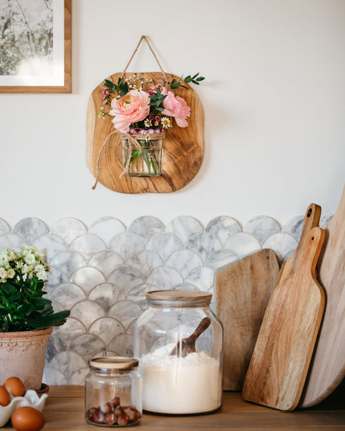 7 Om het af te maken maak je een touwtje van jute dat door de 2 gaatjes gaat die bovenaan de houten plank geboord zijn. Plaats de deksel op de hals van de pot. Voeg een paar verse bloemen toe en je DIY is klaar om weg te geven.