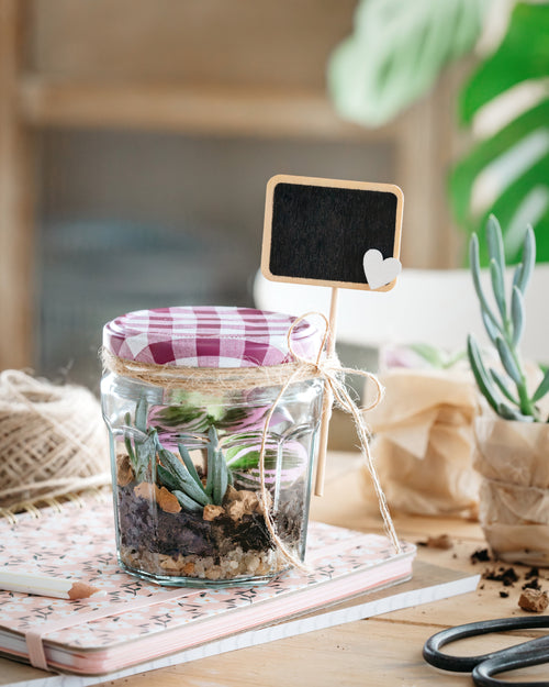 7 Maak het terrarium dicht door de deksel erop te draaien en bind het bordje met jute touw aan de glazen pot vast.