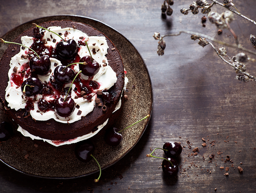 3 Halveer de taart voorzichtig overlangs. Bestrijk de onderkant van de cake met de helft van de mascarpone en de kersenjam. Leg de bovenkant er op en bestrijk met de rest van de kersenjam en mascarpone. Schaaf met een dunschiller nog wat chocolade over de taart. Garneer met kersen.
