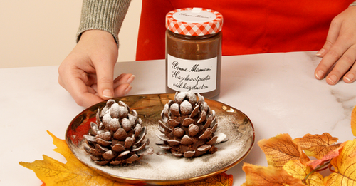 3 Steek de chocolade cornflakes met de kromming naar boven in de kegeltjes om een dennenappel te maken.