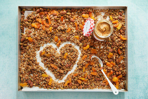 1 Verwarm de oven voor op 160°C. Doe alle ingrediënten op de abrikozen en quinoa na in een kom en meng door elkaar. Voeg ½ theelepel zout toe en verdeel alles over een met bakpapier beklede bakplaat. Rooster de granola in het midden van de oven in ca. 20 min. goudbruin en krokant. Schep halverwege om.